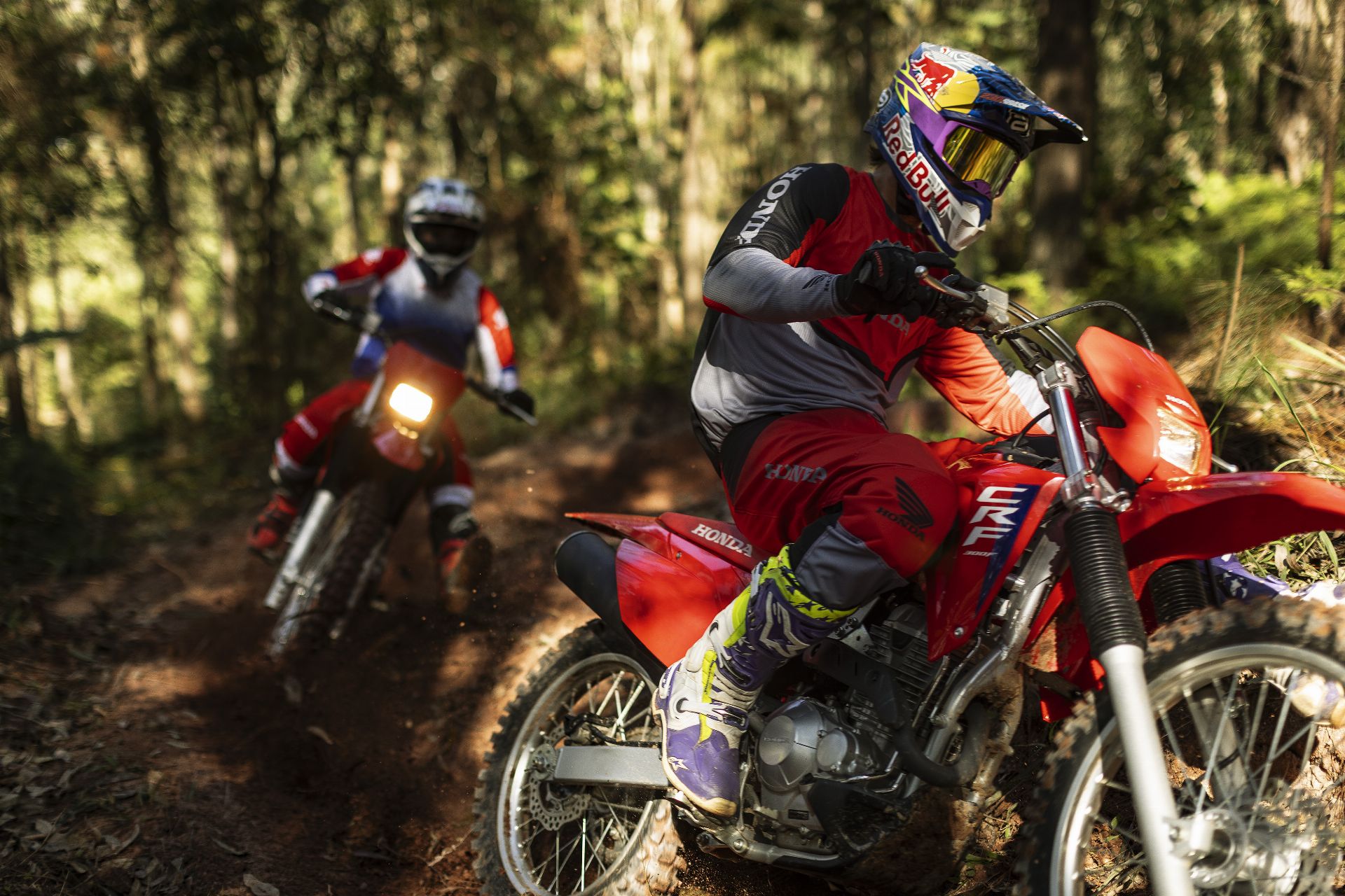 As linhas marcantes e carenagens robustas fazem da nova CRF 300F uma presença dominante nas trilhas.